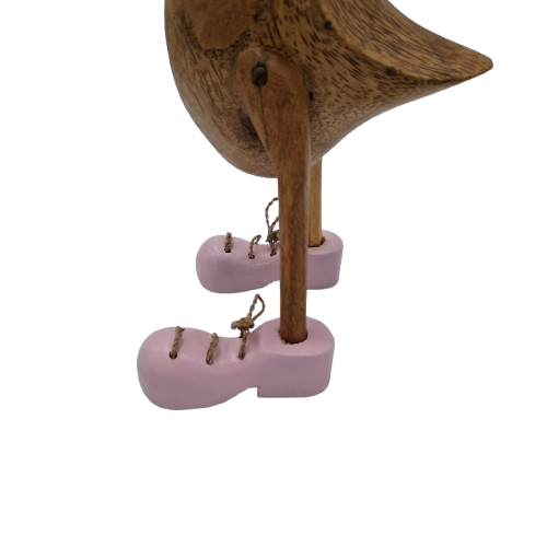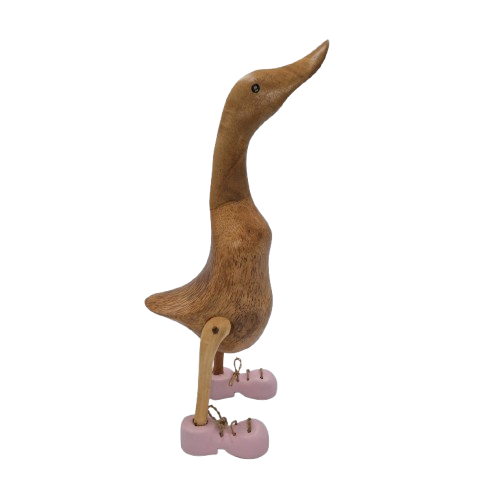 Blush Medium to średniej wielkości kacza figurka o wyjątkowo delikatnych, różowych butach i przyjaznym wyrazie. Tworzona wyłącznie ręcznie przez balijskich artystów, ujmuje nie tylko pięknem, ale i historią – każdy egzemplarz powstaje osobno, dlatego rozkład słojów, drobne krzywizny i odcienie sprawiają, że Twoja kaczka jest jedyna na świecie.