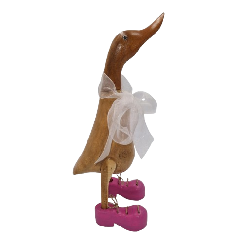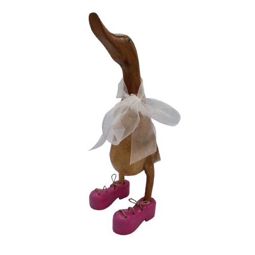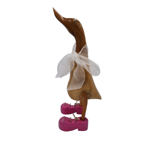 Rosie Mini to maleńka, ręcznie wyrzeźbiona kaczka z Bali, która zachwyca energią różowych butów oraz subtelną, białą kokardą dodającą wdzięku i uroku. Każda z tych figurek powstaje indywidualnie, dzięki czemu nie znajdziesz dwóch takich samych – różni się nie tylko detalami słojów drewna, ale także charakterem malowania i kokardy.